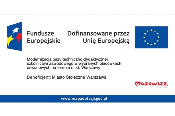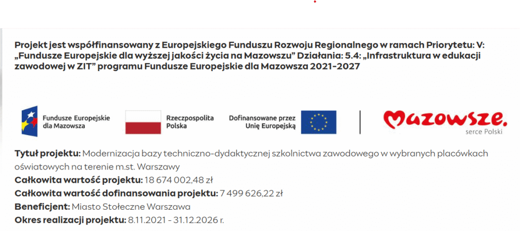 Projekt jest współfinansowany z Europejskiego Funduszu Rozwoju Regionalnego w ramach Priorytetu: V: „Fundusze Europejskie dla wyższej jakości życia na Mazowszu” Działania: 5.4: „Infrastruktura w edukacji zawodowej w ZIT” programu Fundusze Europejskie dla Mazowsza 2021-2027.