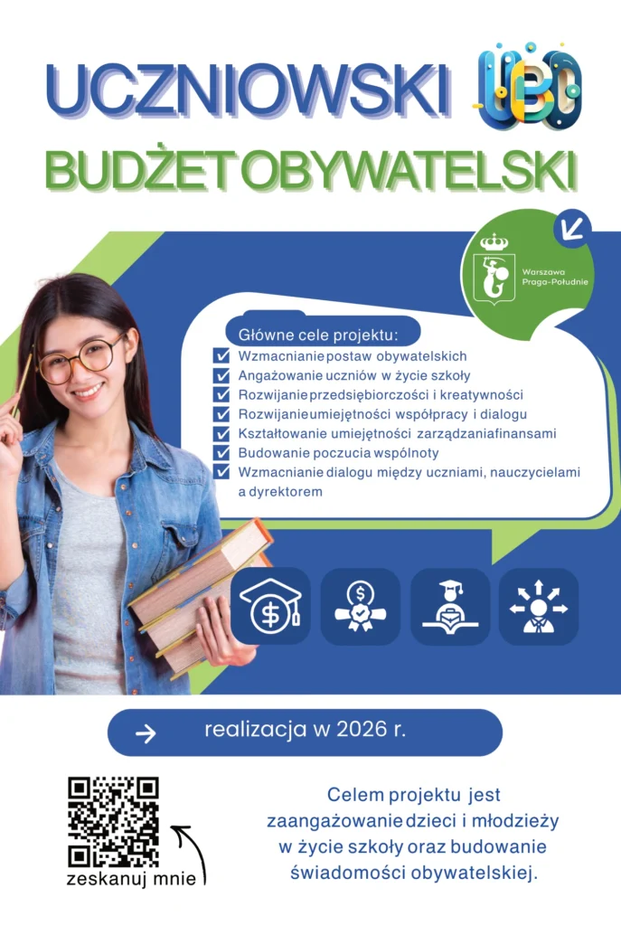 Celem „Uczniowskiego Budżetu Obywatelskiego na Pradze-Południe” (zwanego dalej UBO) jest umożliwienie uczniom zgłaszania i realizowania projektów, które przyczynią się do poprawy funkcjonowania ich szkoły i społeczności szkolnej. Inicjatywa ma na celu aktywizację uczniów, promowanie postaw obywatelskich, rozwijanie umiejętności współpracy i budowanie zaangażowania społecznego.